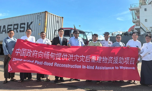 近日,中国政府援助缅甸洪灾灾后重建物资陆续运抵仰光港口。9月15日,贾俊杰公参、仰光省政府自然资源部部长佐温在港口进行交接。