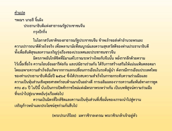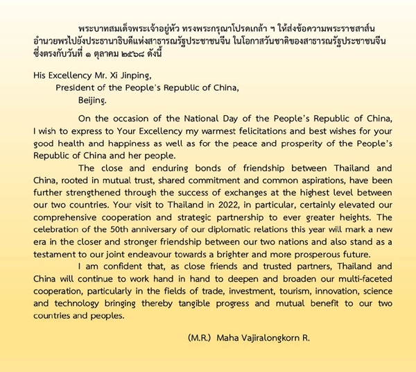 2025年10月1日,泰国国王哇集拉隆功致电中国国家主席习近平,祝贺中华人民共和国成立76周年。