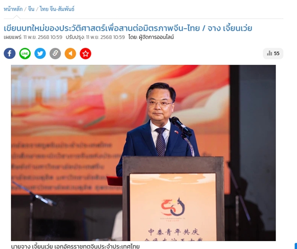 11月11日,在泰国国王哇集拉隆功即将对中国进行国事访问之际,驻泰国大使张建卫在《泰叻报》《每日新闻》《经理人报》等泰国主流媒体发表署名文章《为赓续中泰友好再谱历史新篇》。全文如下: