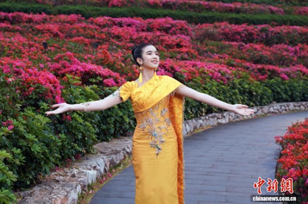 珍娜公主当日在南宁参加“春天的旋律”——2026“青年好伙伴”全球跨国春晚节目录制。她身着柬埔寨传统服饰、佩戴广西壮族绣球耳饰,在南宁青秀山风景区的绚丽花海中深情演唱中文歌曲《我心向往》。