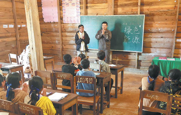 Workers of the Monsoon Wind Power Project communicate with students in a local school in Sekong Province, Laos, on Nov 20. ZHU JIPENG/FOR CHINA DAILY