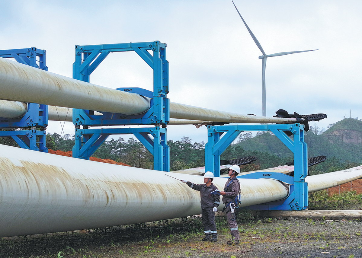 Engineers from China and Laos inspect the wind turbine blades in Sekong Province, Laos, on Nov 19. ZHU JIPENG/FOR CHINA DAILY