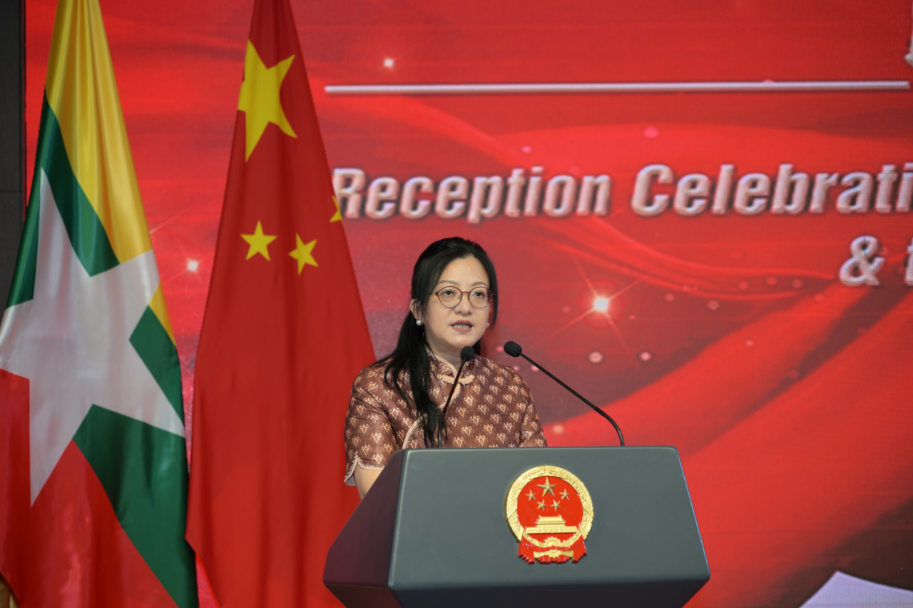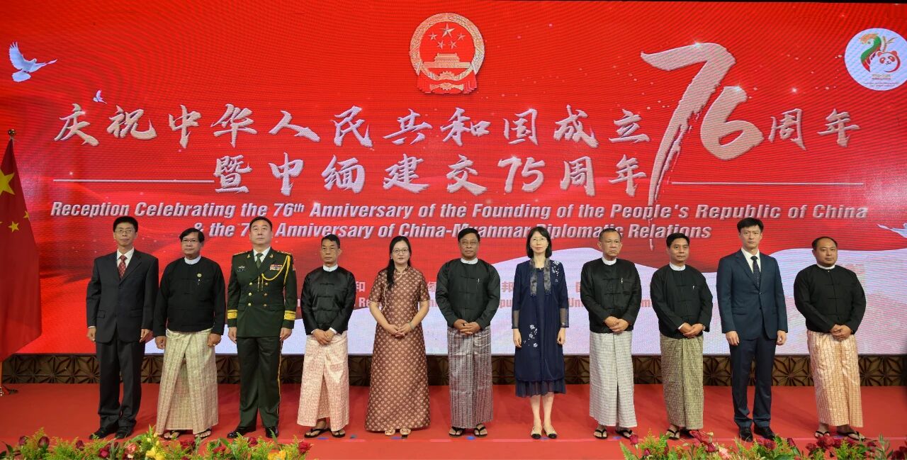 မြန်မာနိုင်ငံဆိုင်ရာ တရုတ်သံရုံးသည် တရုတ်ပြည်သူ့သမ္မတနိုင်ငံ ထူထောင်ခြင်း (၇၆) နှစ်မြောက် နှင့် တရုတ်-မြန်မာ သံတမန်ဆက်ဆံရေး ထူထောင်ခြင်း (၇၅) နှစ်မြောက် အထိမ်းအမှတ် ဂုဏ်ပြု ဧည့်ခံပွဲကို စက်တင်ဘာလ ၂၄ ရက်နေ့တွင် ရန်ကုန်မြို့၌ ကျင်းပခဲ့သည်။ အခမ်အနားသို့ သံအမတ်ကြီး Ms. Ma Jia ၊ မြန်မာနိုင်ငံ နိုင်ငံတော် သမ္မတရုံးဝန်ကြီးဌာန (၁) ပြည်ထောင်စုဝန်ကြီး ဦးတင်အောင်စန်း၊ နိုင်ငံတော် သမ္မတရုံးဝန်ကြီးဌာန (၄) ပြည်ထောင်စုဝန်ကြီး ဦးထွန်းအုံ၊ ဘဏ္ဍာရေးနှင့် အခွန်ဝန်ကြီးဌာန ပြည်ထောင်စုဝန်ကြီး ဒေါက်တာကံဇော်၊ ရန်ကုန်တိုင်းဒေသကြီး ဝန်ကြီးချုပ် ဦးစိုးသိန်း၊ အမှတ် (၅) စစ်ဆင်ရေးအထူးအဖွဲ့မှူး ဒုတိယဗိုလ်ချုပ်ကြီး ကိုကိုဦး နှင့် မြန်မာနိုင်ငံ နယ်ပယ်အသီးသီးမှ ချစ်ကြည်ရေး ပုဂ္ဂိုလ်များ၊ နိုင်ငံအသီးသီးမှ သံတမန်အရာရှိများ၊ နိုင်ငံတကာ အသင်းအဖွဲ့ကိုယ်စားလှယ်များ၊ တရုတ်ရင်းနှီးမြှုပ်နှံမှုအဖွဲ့အစည်းများ၊ တရုတ်နွယ်ဖွား ကိုယ်စားလှယ်များ စသည့် လူဦးရေ စုစုပေါင်း ၅၀၀ ကျော် တက်ရောက်ခဲ့ကြသည်။