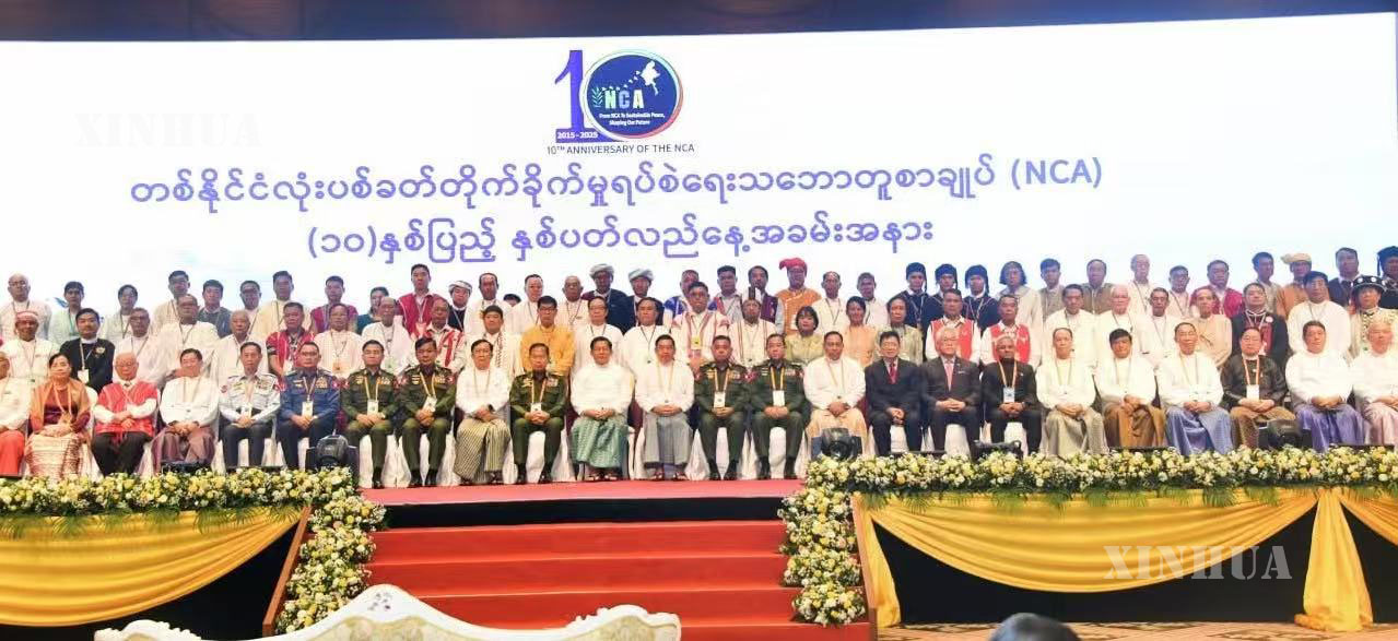 နေပြည်တော်ရှိ အပြည်ပြည်ဆိုင်ရာကွန်ဗင်းရှင်းဗဟိုဌာန-၁ ၌ တစ်နိုင်ငံလုံးပစ်ခတ်တိုက်ခိုက်မှုရပ်စဲရေး သဘောတူစာချုပ် (NCA) ၁၀ နှစ်ပြည့် နှစ်ပတ်လည်နေ့ အခမ်းအနား ကျင်းပမှုအား တွေ့ရစဉ် (ဆင်ဟွာ)