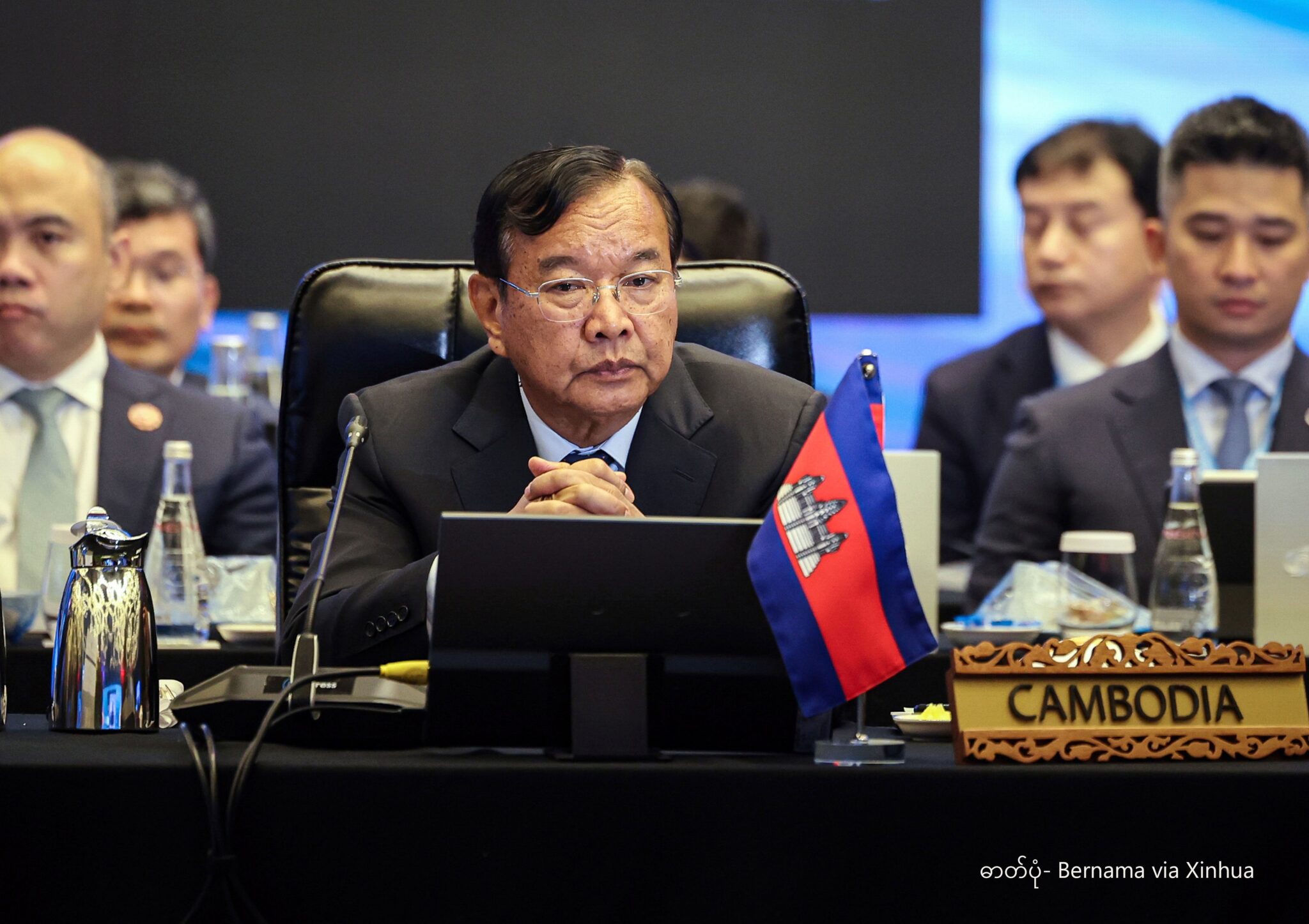 မလေးရှားနိုင်ငံ ကွာလာလမ်ပူမြို့တွင် ကျင်းပသည့် အာဆီယံနိုင်ငံခြားရေးဝန်ကြီးများ အထူးအစည်းအဝေး တက်ရောက်နေသော ကမ္ဘောဒီးယား ဒုတိယဝန်ကြီးချုပ်နှင့် နိုင်ငံခြားရေးဝန်ကြီး ပရက်ခ် ဆိုခွန်းအား ၂၀၂၅ ခုနှစ် ဒီဇင်ဘာ ၂၂ ရက်က တွေ့ရစဉ် (ဓာတ်ပုံ- Bernama via Xinhua)