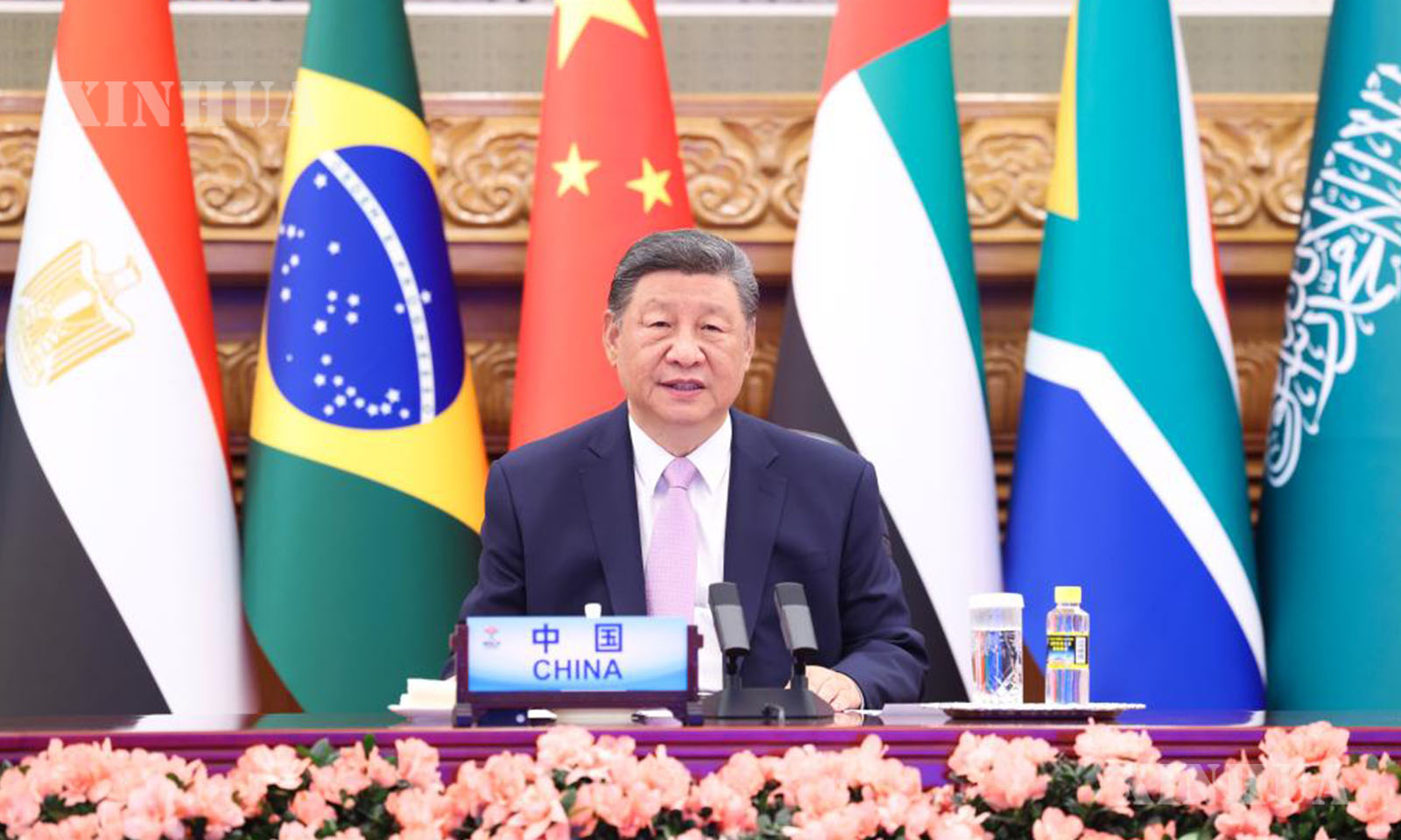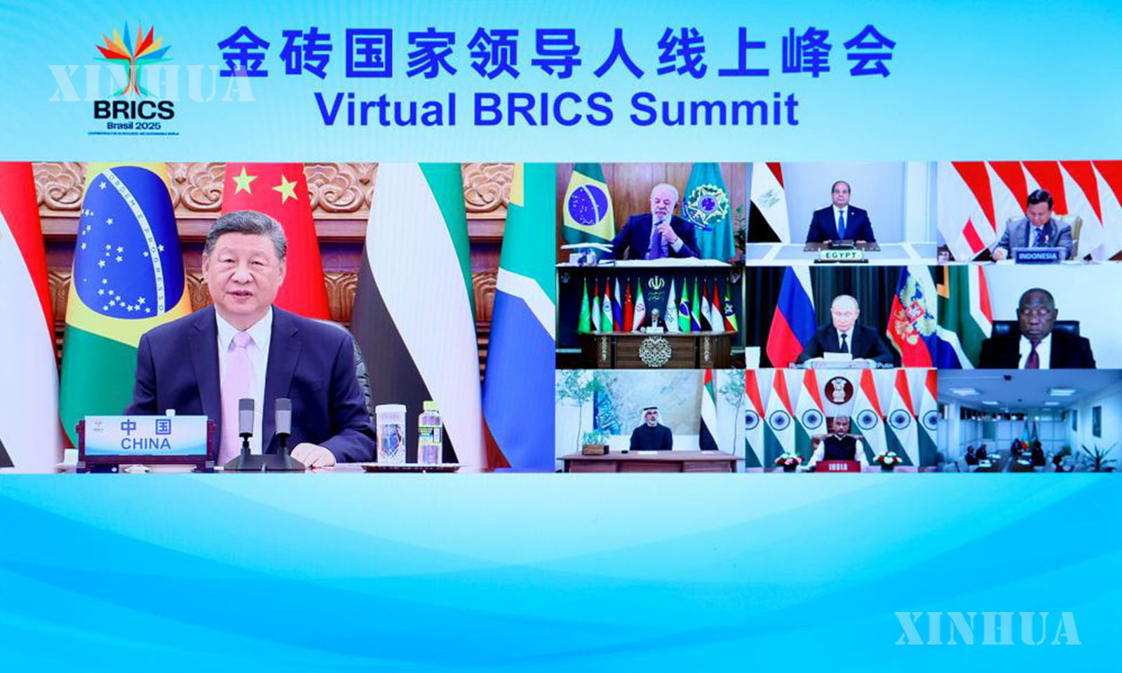 အွန်လိုင်းမှပြုလုပ်သည့် BRICS ထိပ်သီးဆွေးနွေးပွဲသို့ တက်ရောက်လာသည့် တရုတ်နိုင်ငံ သမ္မတ ရှီကျင့်ဖိန်ကို ၂၀၂၅ ခုနှစ် စက်တင်ဘာ ၈ ရက်က တွေ့ရစဉ် (ဆင်ဟွာ)