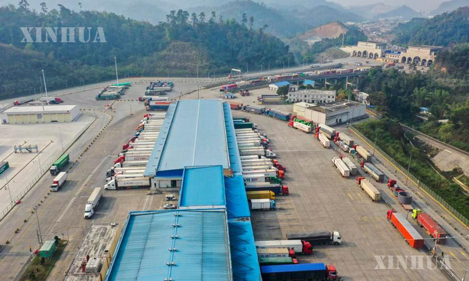 တရုတ်နိုင်ငံ တောင်ပိုင်း ကွမ်ရှီးကျွမ့် ကိုယ်ပိုင်အုပ်ချုပ်ခွင့်ရဒေသ ဖိန်ရှန်းခရိုင်ရှိ ချစ်ကြည်ရေးဖြတ်သန်းဂိတ်တွင် တရုတ်နိုင်ငံနှင့် အာဆီယံမှ လယ်ယာထွက်ကုန်များ တင်ဆောင်ထားသည့် ထရပ်ကားများကို ၂၀၂၅ ခုနှစ် မတ် ၂၁ ရက်က တွေ့ရစဉ် (ဆင်ဟွာ)