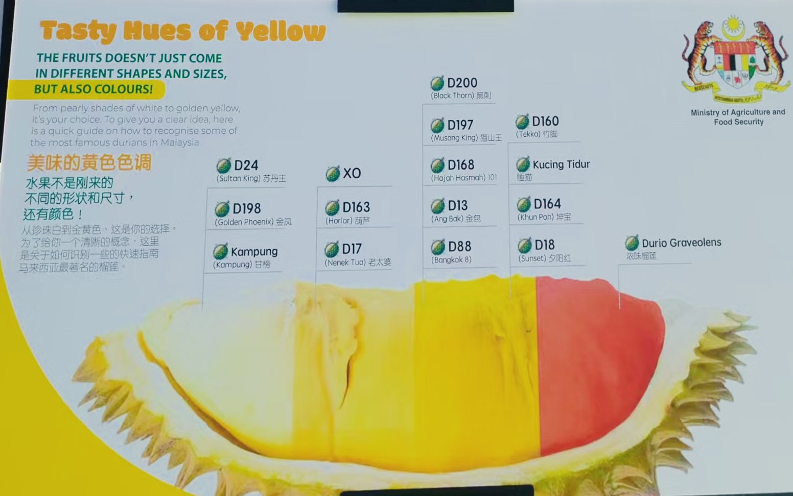 นอกจากนี้ สถานเอกอัครราชทูตมาเลเซียยังนำเสนอคู่มือฉบับย่อ เกี่ยวกับวิธีการจำแนกทุเรียนที่โด่งดังที่สุดในมาเลเซีย โดยพิจารณาจากสีสันเนื้อทุเรียน เพื่อให้ผู้บริโภคได้เลือกรับประทานตามความหวานที่ต้องการ