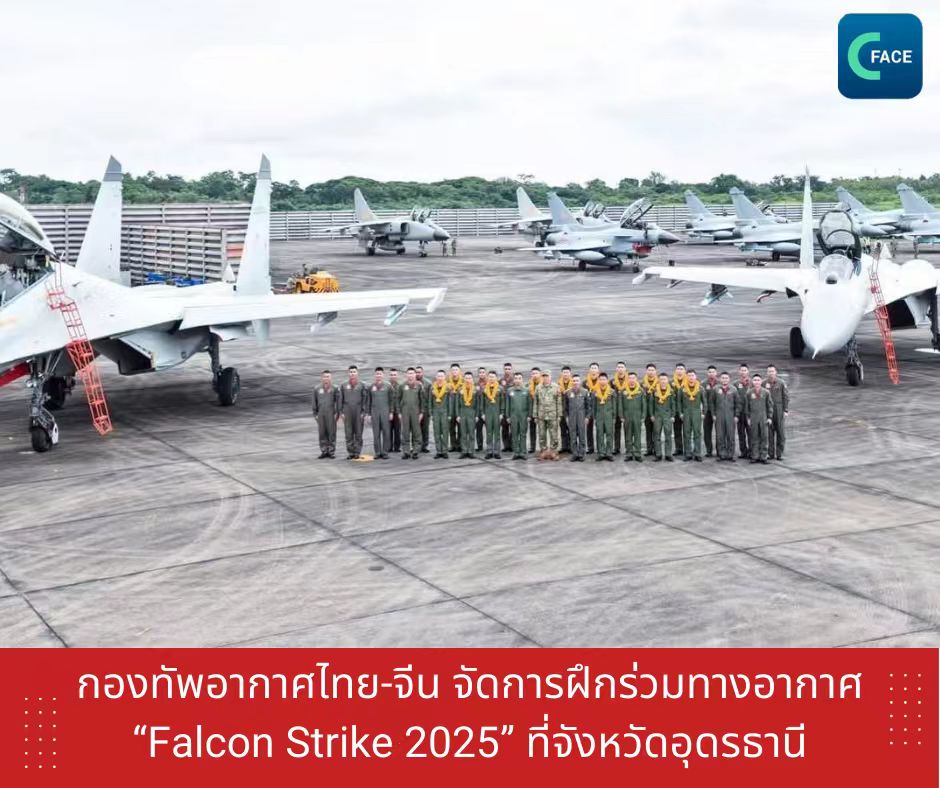 “Falcon Strike 2025” การฝึกร่วมทางอากาศระหว่างกองทัพอากาศไทย (RTAF) และกองทัพอากาศแห่งกองทัพปลดปล่อยประชาชนจีน (PLAAF) ปีนี้ จัดการฝึกร่วมทางอากาศตั้งแต่วันที่ 18-25 กันยายน 2025 ที่กองบิน 23 จังหวัดอุดรธานี