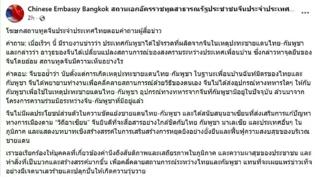 คำตอบ: จีนขอย้ำว่า นับตั้งแต่การเกิดเหตุปะทะชายแดนไทย-กัมพูชา ในฐานะเพื่อนบ้านฉันท์มิตรของไทยและกัมพูชา จีนได้พยายามทำงานเพื่อคลี่คลายสถานการณ์ด้วยวิธีของตนเอง จีนไม่ได้ส่งอุปกรณ์ทางทหารใดๆ ให้กับกัมพูชาเพื่อใช้ในเหตุปะทะชายแดนไทย-กัมพูชา อุปกรณ์ทางทหารจากจีนที่กัมพูชามีอยู่ในปัจจุบัน ล้วนมาจากโครงการความร่วมมือระหว่างจีน-กัมพูชาที่มีอยู่แล้ว
