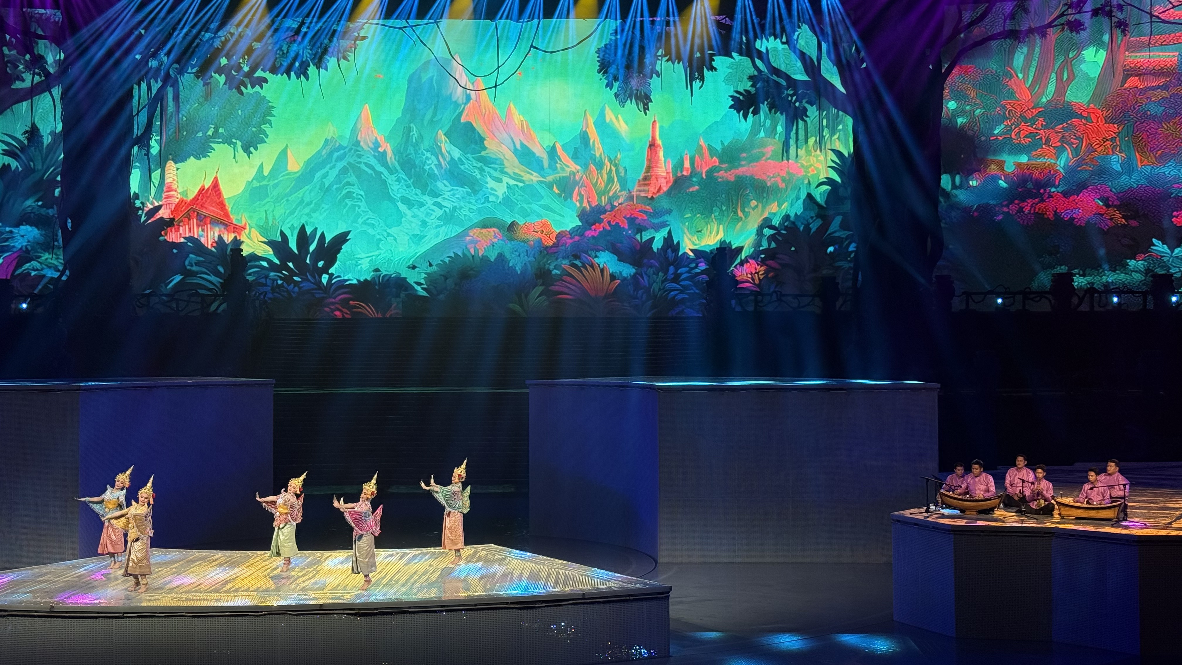 ภายในโรงละครใหญ่แห่งนี้ ได้สร้างสรรค์ออกแบบเวทีอย่างประณีต โดยใช้แม่น้ำโขง-ล้านช้างเป็นแกนหลักถ่ายทอดเรื่องราวอันล้ำค่า เมื่อม่านการแสดงเปิดออก“สายน้ำ” สีเงิน ดุจริบบิ้นไหลรินอยู่บนเวที พาผู้ชมเข้าสู่โลกอันลึกลับ และเปี่ยมด้วยเสน่ห์ต่างถิ่นอันหลากสีสัน ขณะที่รอบเวทีได้เสกสรรค์เสมือนอยู่ท่ามกลางป่าฝนเขตร้อน ผสมผสานการใช้แสงไฟและเวทีปรับระดับขึ้นลง และพ่นหมอกน้ำเพิ่มสร้างบรรยากาศให้หลงใหล ถ่ายทอดสายน้ำบ้างก็เชี่ยวกราก บ้างก็เรียบสงบตามจังหวะทำนองของการแสดง รวมถึงสื่อวิวทิวทัศน์ตระการตาริมสองฝั่ง และวัฒนธรรมหลากหลายของแต่ละประเทศอย่างมีชีวิตชีวา