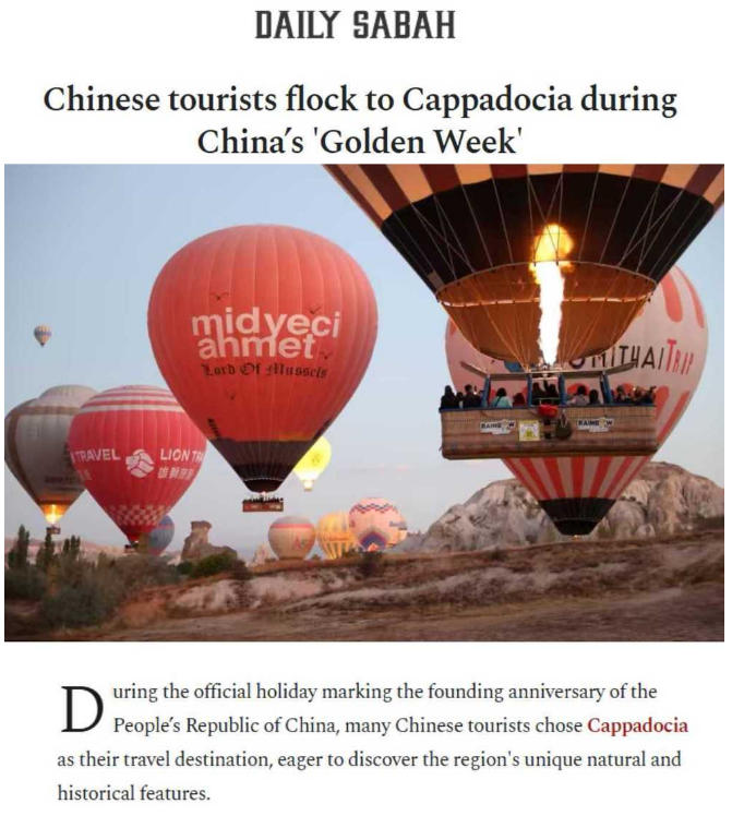 เว็บไซต์ The Daily Sabah ของตุรกีรายงานเมื่อเร็วๆ นี้ว่า นักท่องเที่ยวจีนจำนวนมากเลือกเมืองคัปปาโดเกียเป็นจุดหมายปลายทาง ซึ่งมีชื่อเสียงด้วยการนั่งบอลลูนลมร้อนชมทิวทัศน์ การขี่ม้า และการท่องเที่ยวแบบออฟโรด นักท่องเที่ยวจีนได้ให้แรงขับสำคัญสำหรับการท่องเที่ยวในท้องถิ่น