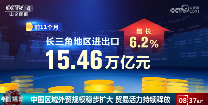 ในเขตสามเหลี่ยมปากแม่น้ำแยงซี มูลค่าการนำเข้าและส่งออกทำลายสถิติในช่วงเดียวกัน โดยมีมูลค่าถึง 15.46 ล้านล้านหยวน เติบโตขึ้น 6.2% ในช่วงเดียวกัน การค้ากับประเทศที่ร่วมมือในโครงการ"หนึ่งแถบหนึ่งเส้นทาง" (Belt and Road) มีการขยายตัวเพิ่มขึ้น 11%