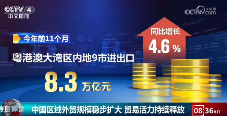 ในช่วง 11 เดือนแรกของปีนี้ มูลค่าการนำเข้าและส่งออกของ 9 เมืองในเขตอ่าวกวางตุ้ง-ฮ่องกง-มาเก๊าของจีน มีมูลค่า 8.3 ล้านล้านหยวน เติบโตขึ้น 4.6% เมื่อเทียบกับช่วงเดียวกันของปีที่แล้ว ซึ่งเป็นการทำลายสถิติการค้าระหว่างประเทศในช่วงเวลาเดียวกันเป็นประวัติการณ์ เกือบ 70% ของสินค้านำเข้าและส่งออกเป็นผลิตภัณฑ์เครื่องจักรและอิเล็กทรอนิกส์ โดยการส่งออกเน้นไปที่อุปกรณ์อิเล็กทรอนิกส์ ชิ้นส่วนคอมพิวเตอร์ และผลิตภัณฑ์เทคโนโลยีสูงอื่นๆ สินค้าบริโภคพื้นฐาน เช่น ผลิตภัณฑ์จากทะเลและนม มีการนำเข้าที่เพิ่มขึ้นมากกว่า 20% ซึ่งสะท้อนให้เห็นถึงการสนับสนุนจากความต้องการภายในประเทศ